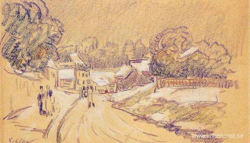 Vi erbjuder dig en hantverksmässig reproduktion på duk av det berömda konstverket 'Tidig snö på Louveciennes' av Alfred Sisley, från Reproduktionsmuseet.