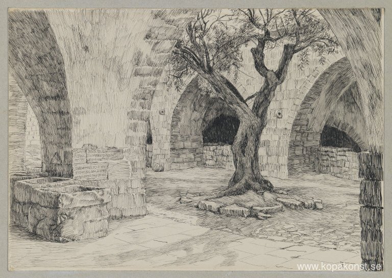 Vi erbjuder dig en hantverksmässig reproduktion på duk av det berömda konstverket 'Uthus till det armeniska klostret, Jerusalem, illustration från ' av James Tissot, från Reproduktionsmuseet.
